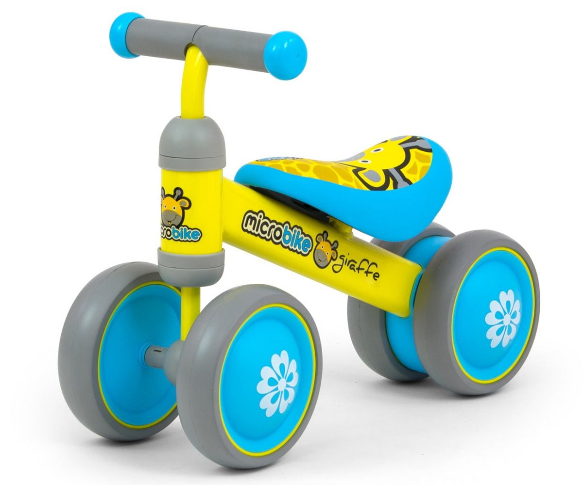 Niebiesko-żółty jeździk Micro Milly Mally z uroczą żyrafą na siodełku, ramie i kierownicy. W sam raz na wakacje. Tym bardziej, że dzięki niewielkim rozmiarom i niskiej wadze, można go zabrać ze sobą w podróż.