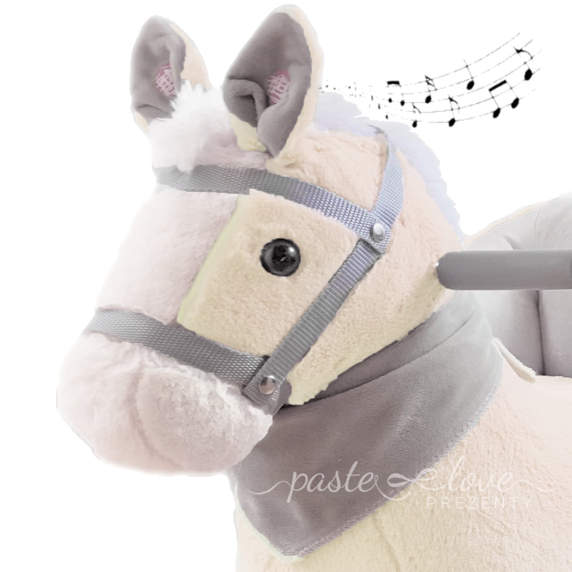 Producenci zabawki zadbali o każdy detal. Nie mogło więc zabraknąć kantaru na małym pyszczku, pluszowej chustki i podstawki na stopy, które zastępują strzemiona. A żeby jeszcze bardziej oddać urok jazdy na koniu, po naciśnięciu na miękkie uszka, dziecko usłyszy dźwięki – galopu i rżenia. To kolejny element, który pozytywnie wpłynie na rozwój malucha.