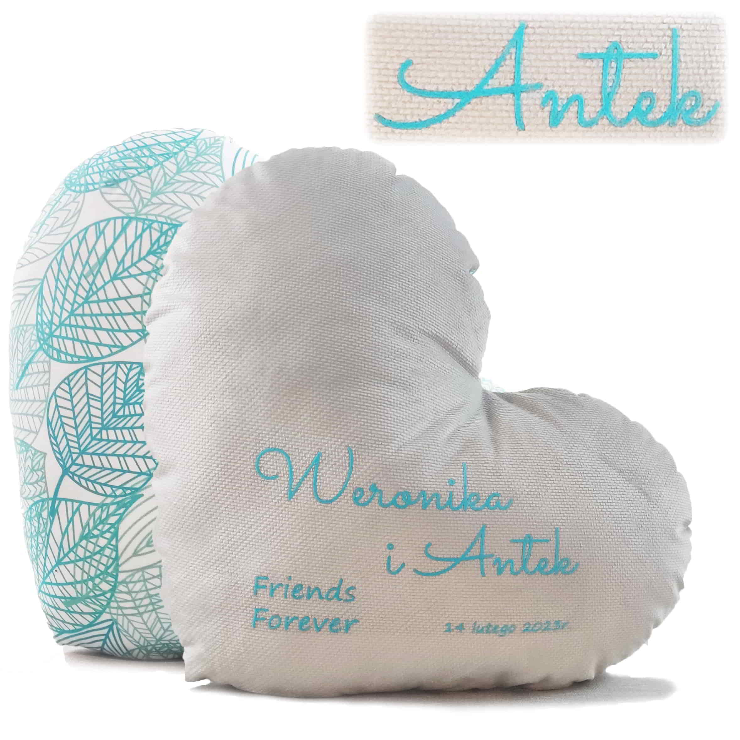✔️ Na poduszce możemy umieścić dowolną ilość znaków, co pozwala na wpisanie imion i krótkiej dedykacji, np. „Weronika i Antek – Friends Forever” jak na zdjęciu, lub „Dla Zuzi – Najukochańszej Siostry. Twój Brat Krzyś”.