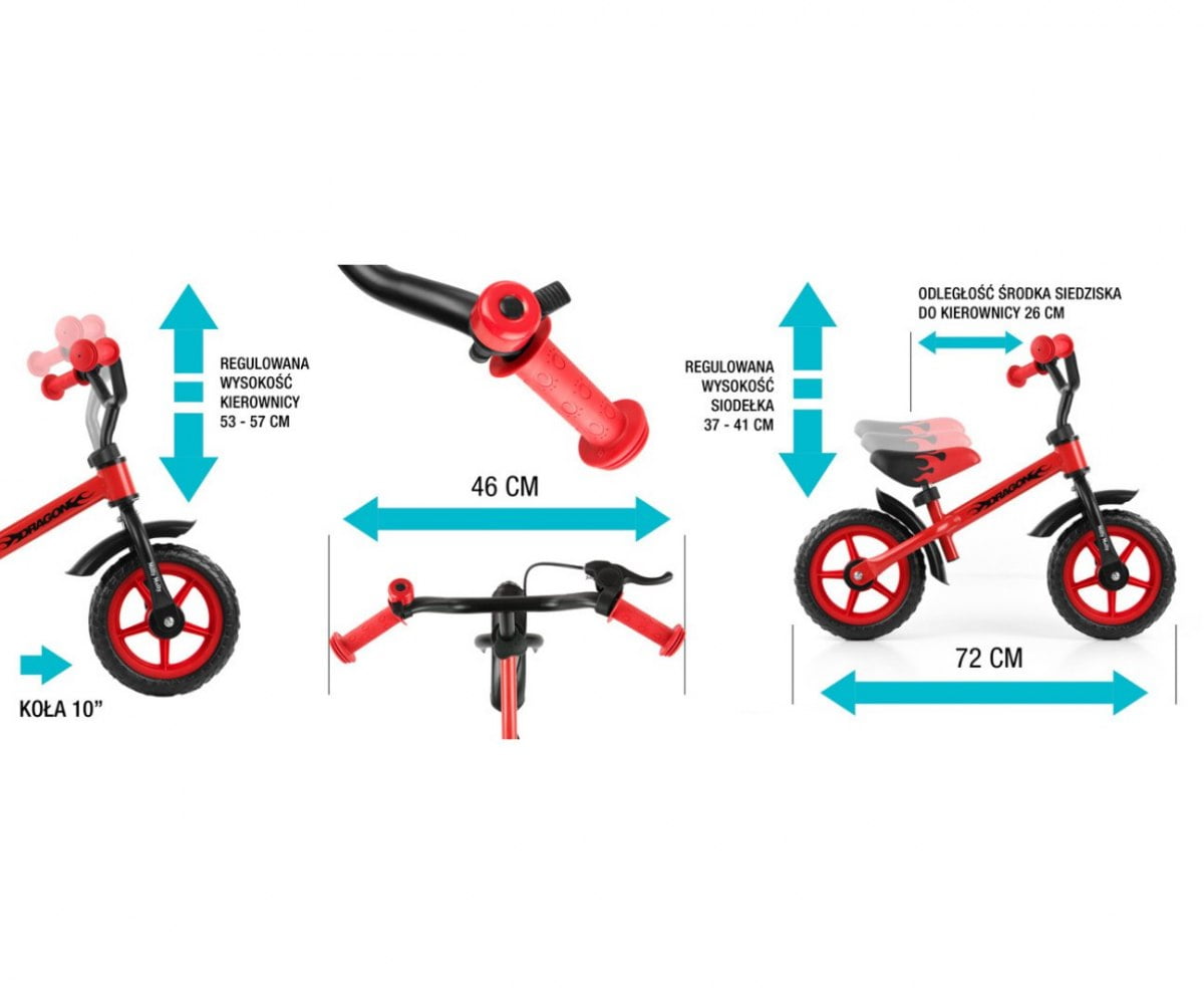 Dragon Milly Mally to dobry wybór dla dziecka, które rozpoczyna naukę jazdy na rowerze. Zaprojektowany tak, by nawet drobny dwulatek, czuł się na nim pewnie i komfortowo. Dzięki regulacji siodełko i kierownicę można dopasować do wzrostu dziecka. Brak pedałów ułatwia koncentrację na utrzymaniu równowagi, koordynacji, zachowaniu kierunku jazdy i dostosowaniu prędkości do okoliczności.