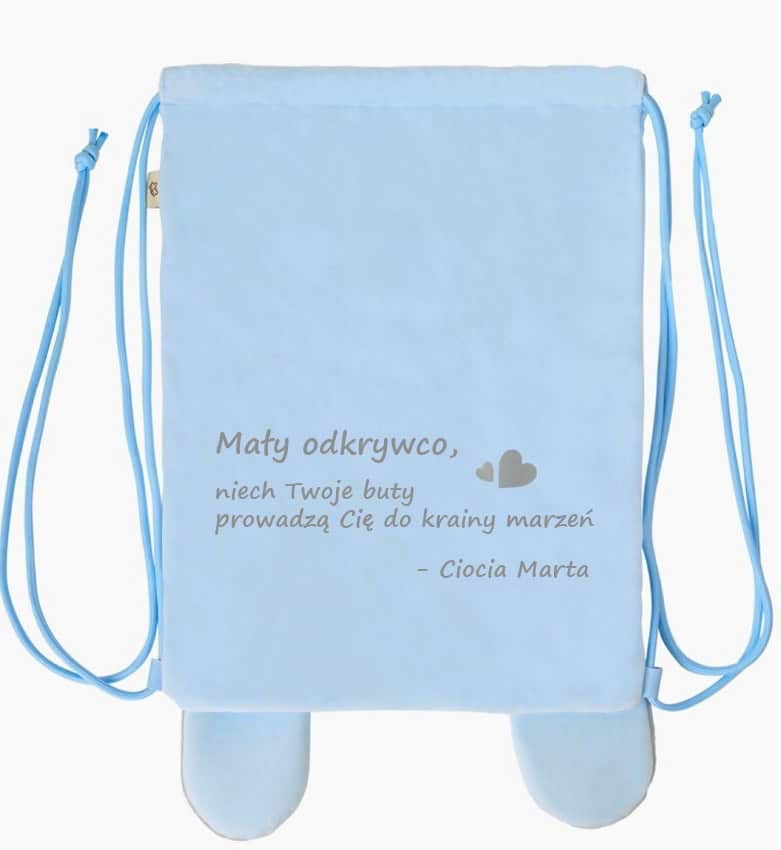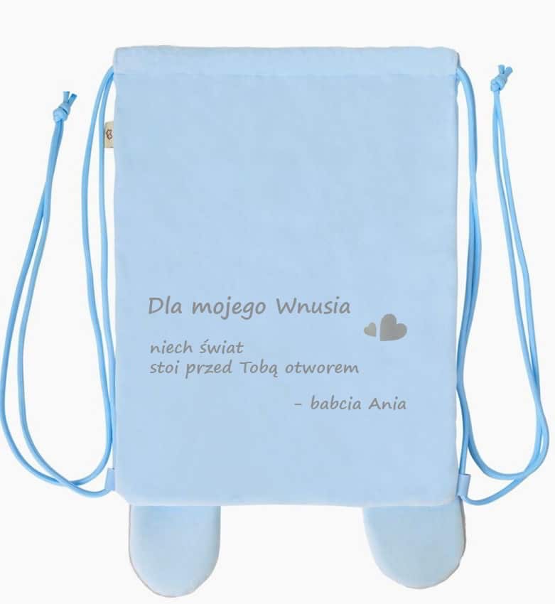 - ✔️ Personalizacja: imię z przodu i dedykacja/życzenia z tyłu worka